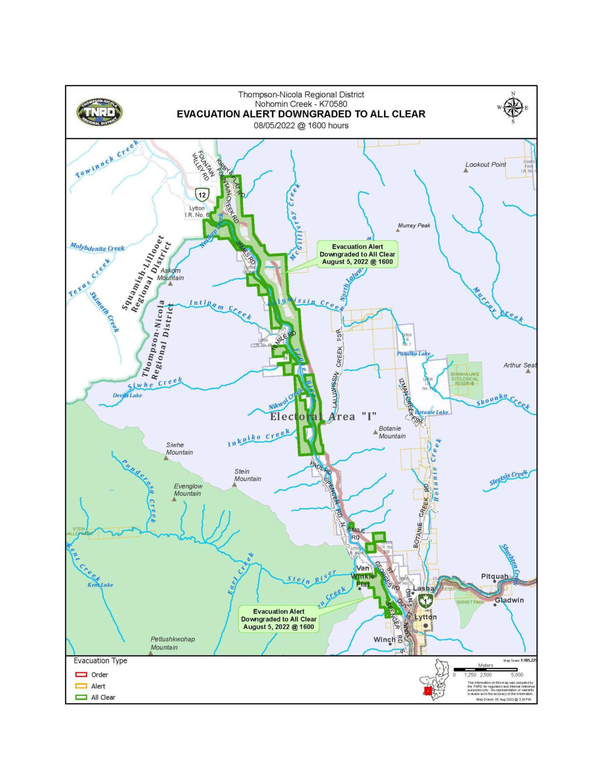 In a news release Friday, the Thompson Nicola Regional District says all TNRD properties north of Lytton along Highway 12, as well as properties on the west side of the Fraser River and north of Stein River are no longer on alert.